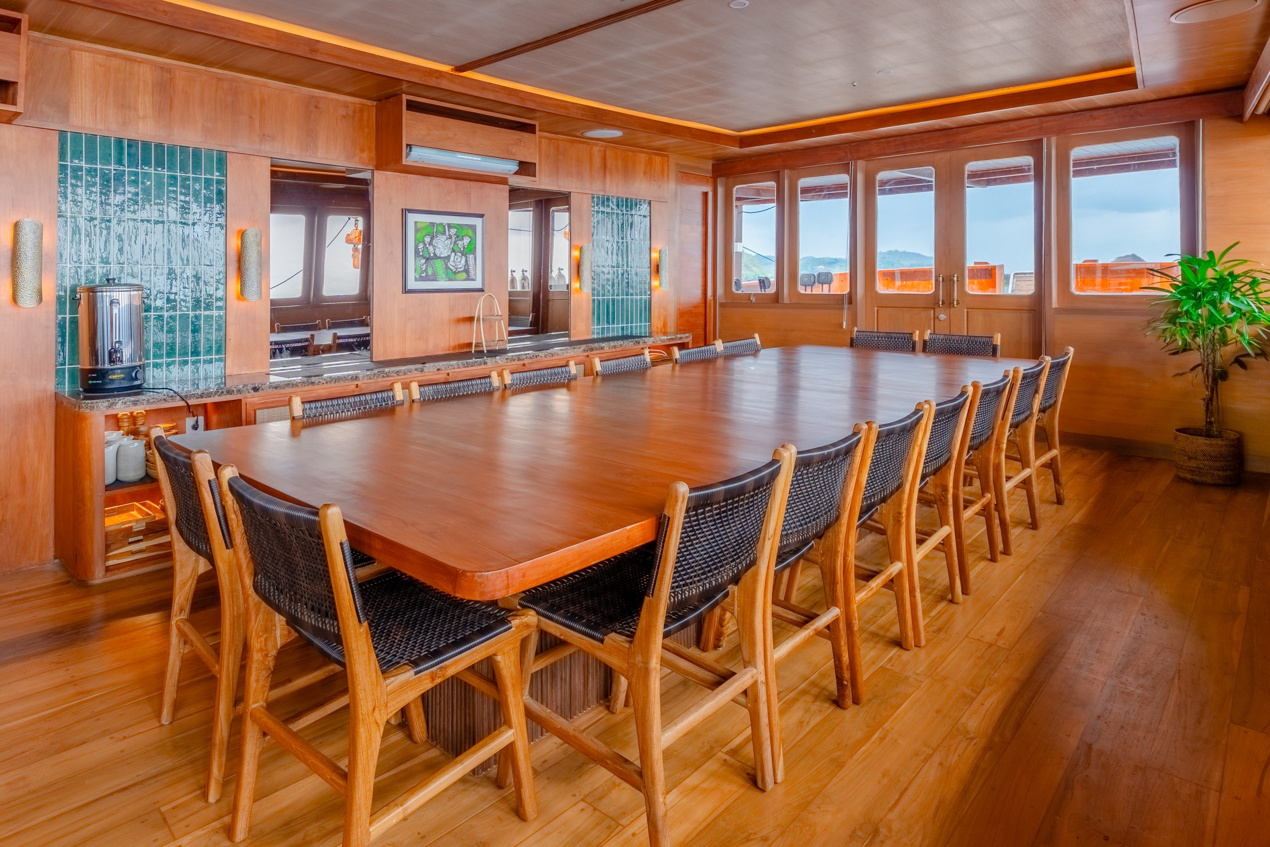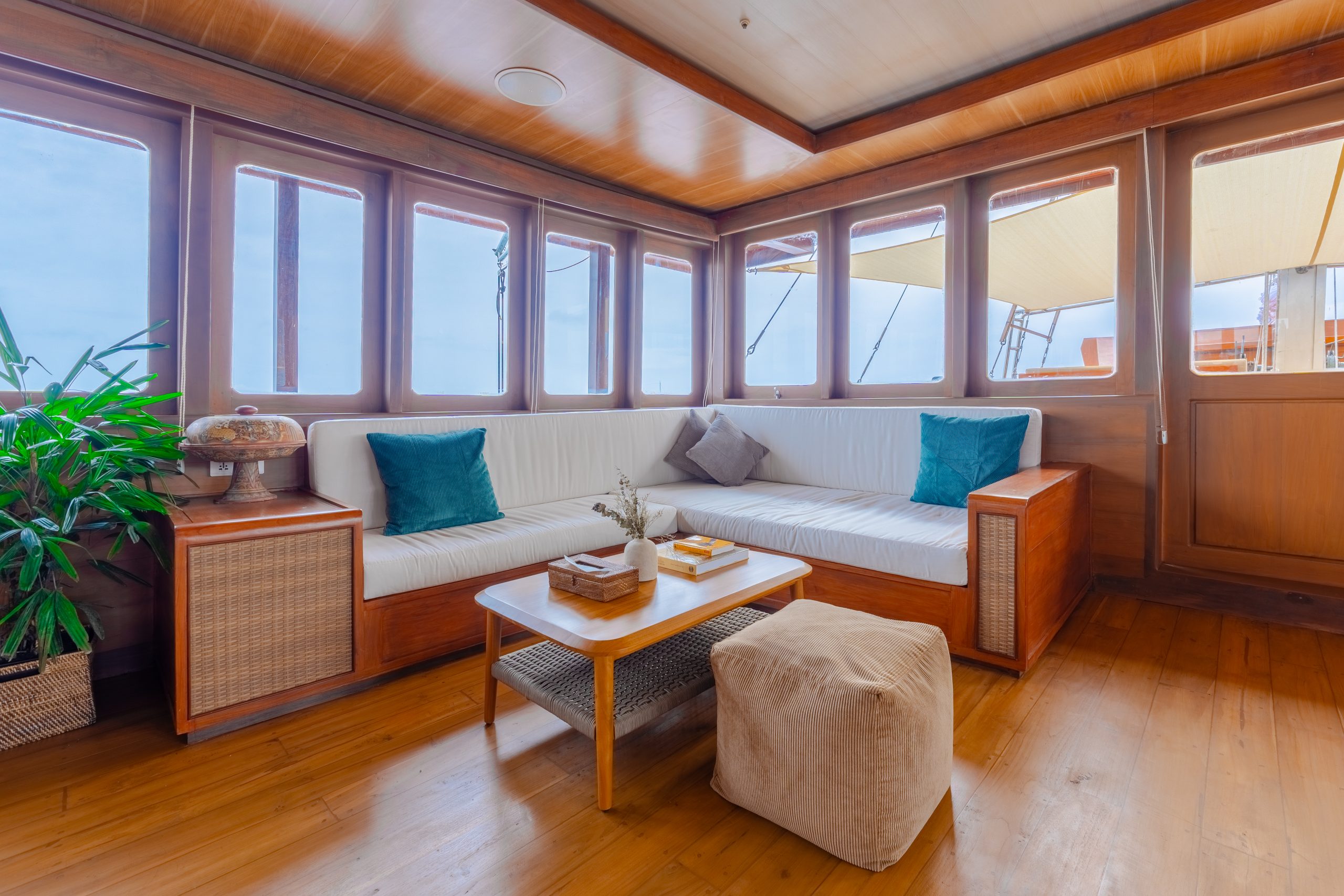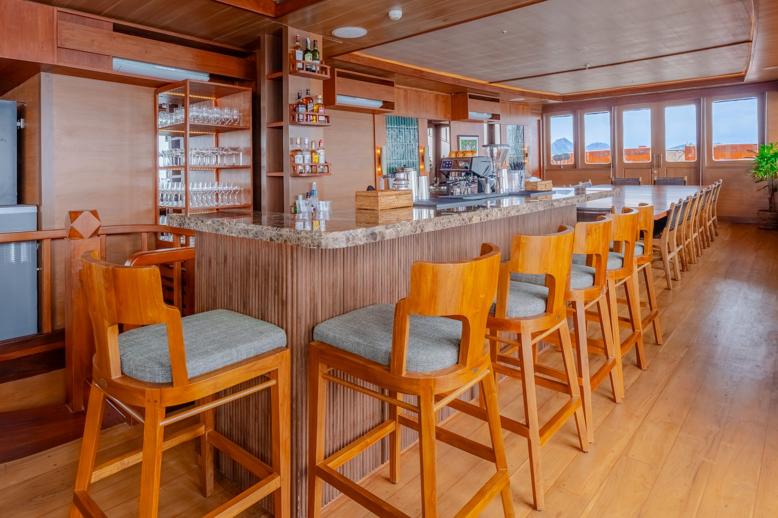 The spacious lounge is ideal for social gatherings, complete with a fully stocked bar, onboard entertainment, and a private karaoke area.